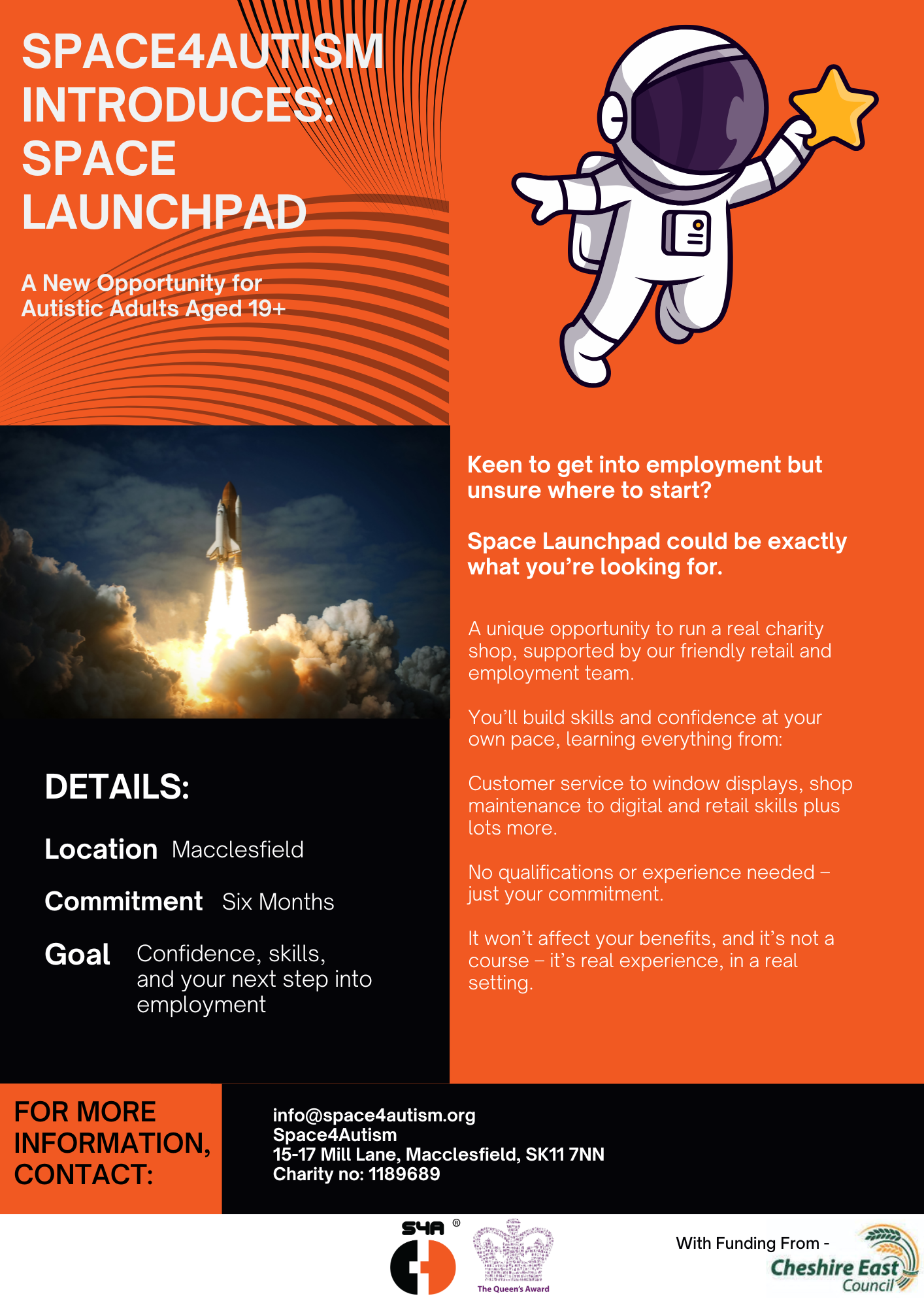 Space Launchpad – an employment project for adults 19+ yrs. Learn new skills to support you into employment or volunteering. Work in our charity shop based in Macclesfield.